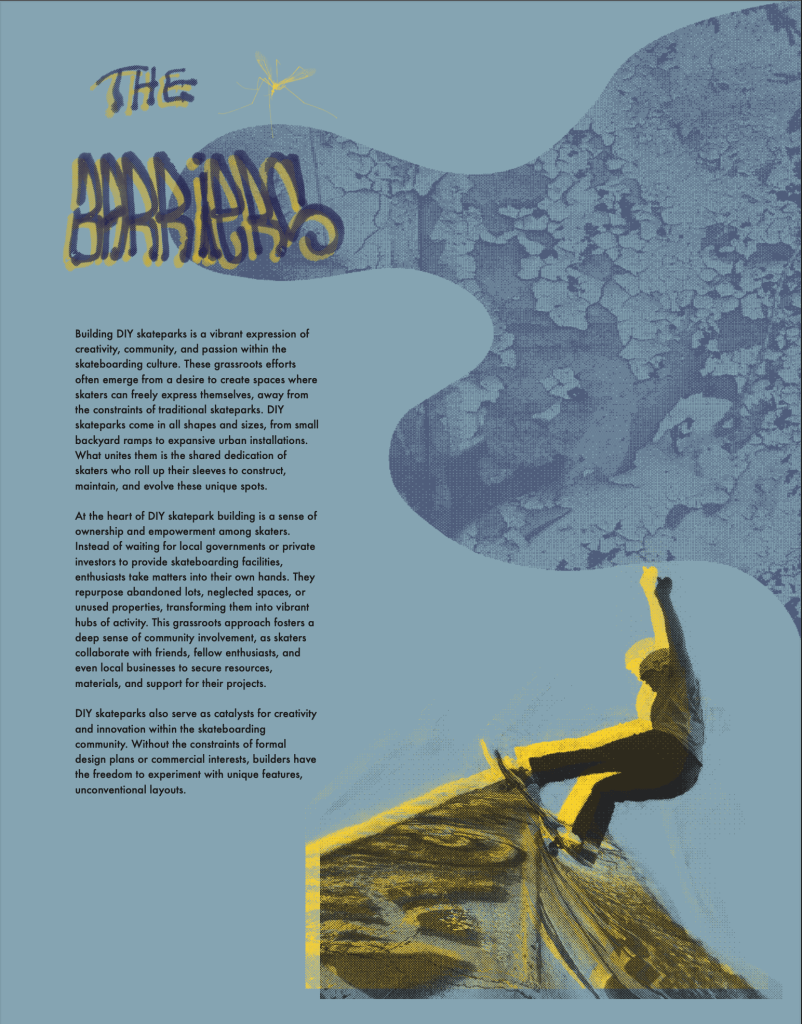 This poster captures the essence of “The Barriers”, a DIY skatepark hidden in the woods of Burlington, Vermont, along the abandoned Champlain Parkway. Over the past decade, skateboarders have added elements piece-by-piece, transforming the space into a vibrant hub. The Barriers have removed to make way for the new Burlington Champlain Parkway. This project is a commemoration of the joy and learning experiences this spot allowed me to have as a skater and a designer.