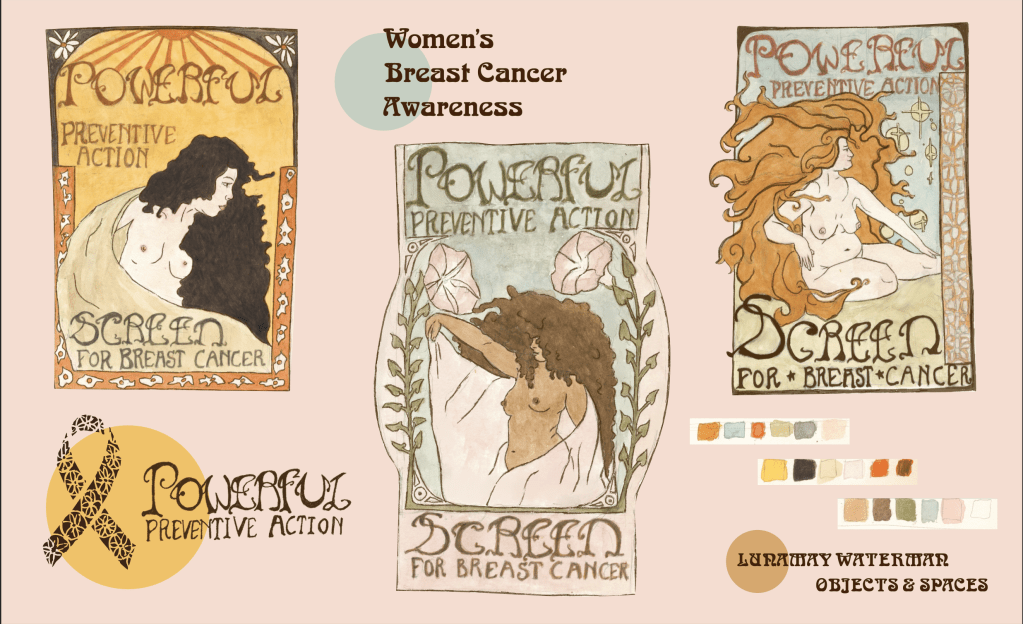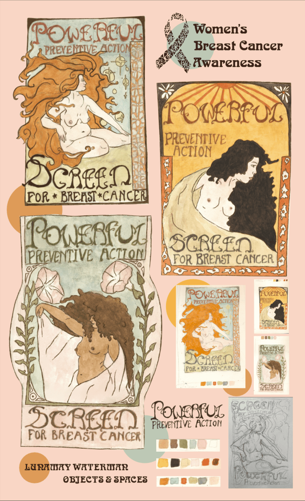 The Powerful Preventative Action project, created for a college class, focuses on raising awareness about breast cancer prevention. The deliverables consist of posters, T-shirts, and a social media campaign. The style of these designs draws inspiration from Art Nouveau and Art Deco.